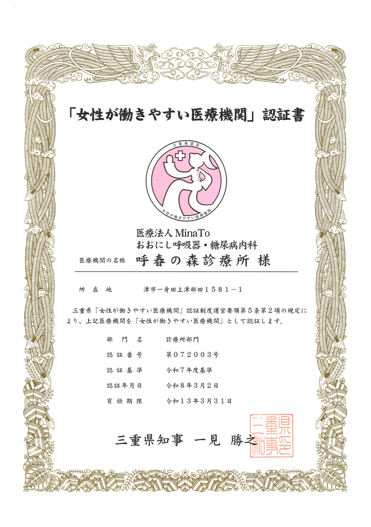 2023年3月、三重県「女性が働きやすい医療機関」に認証され、一見知事より直々に認証書とお祝いの言葉を頂きました。認証されることに満足はなく、医療従事者の確保が目的でもありません。常識を学び、理想を知り、現実とのギャップを少しでも埋めていけるように、私たちなりの方法を今後も考え続けます。